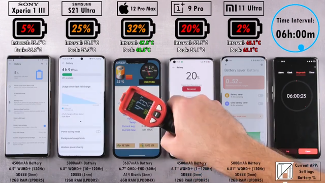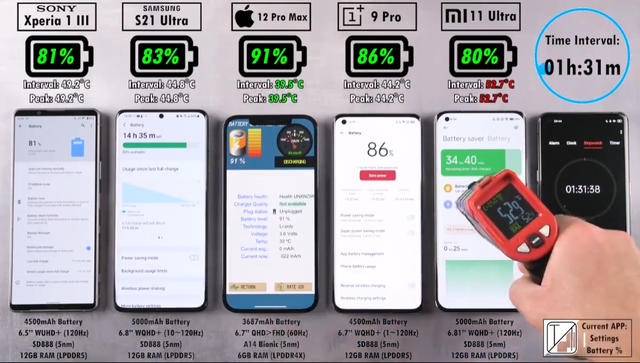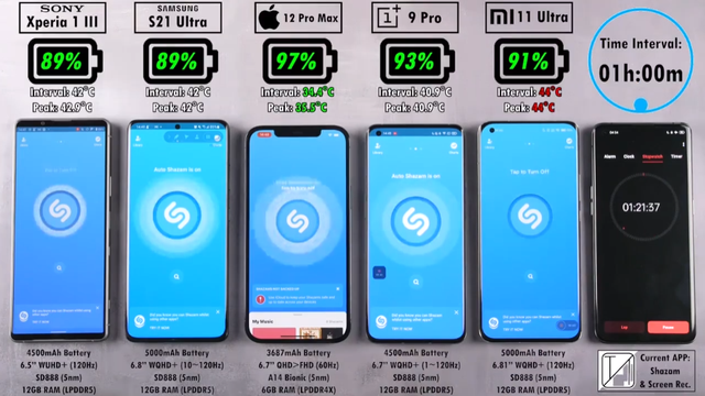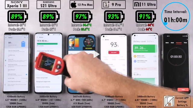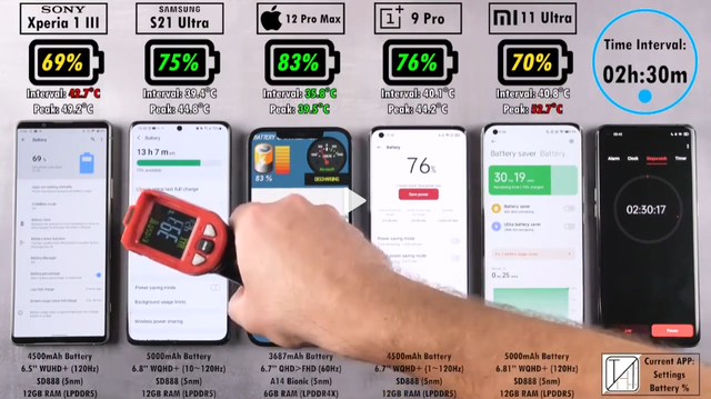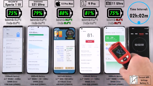 前不久,国外数码达人对五款顶级旗舰手机进行了横评测试,分别是索尼Xperia1 III、三星S21UItra、iPhone12 Pro Max、一加9 Pro以及小米11UItra,对其进行了多项领域的测试,并且每项测试结束后,测量手机屏幕中央位置的温度,直至所有手机电池耗尽,想要直接看结果的朋友可以拉到文章最下方。